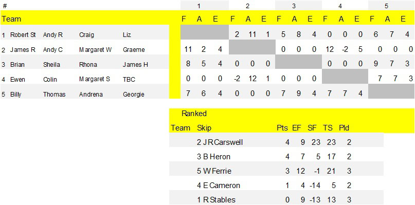 Kirktonfield Cup Results and Standings Teams Team Robert St v Team EwenDate: 03/12/2025Time: 20.30 Team Ewen Lead: Marilyn Team James R v Team BrianDate: 03/12/2025Time: 20.30Team James R v Team BillyDate: 08/12/2025Time: 18.00Team Brian v Team EwenDate: 10/12/2025Time: 20.30 Team Ewen Lead: Marilyn Kirktonfield Cup Semi FinalDate: 15/12/2025Time: 20.30Kirktonfield Cup FinalDate: 17/12/2025Time: 18.00